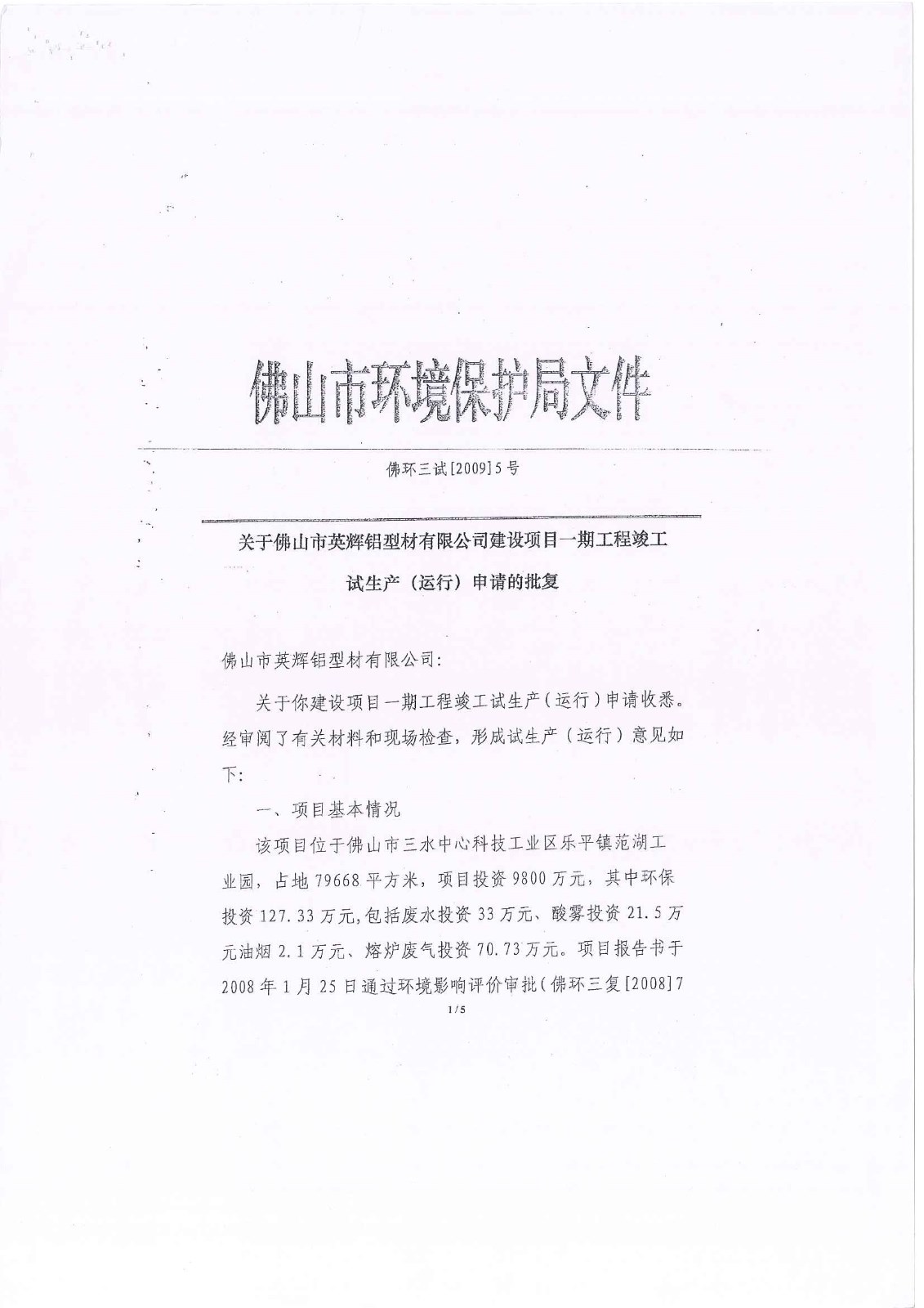 关于佛山市英辉铝型材有限公司建设项目一期工程竣工试生产(运行)申请的批复