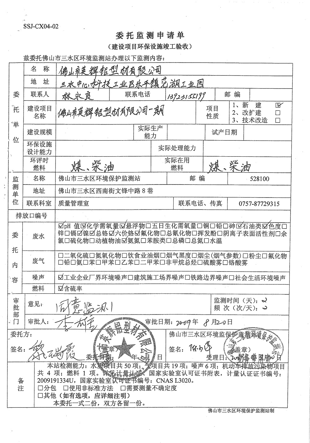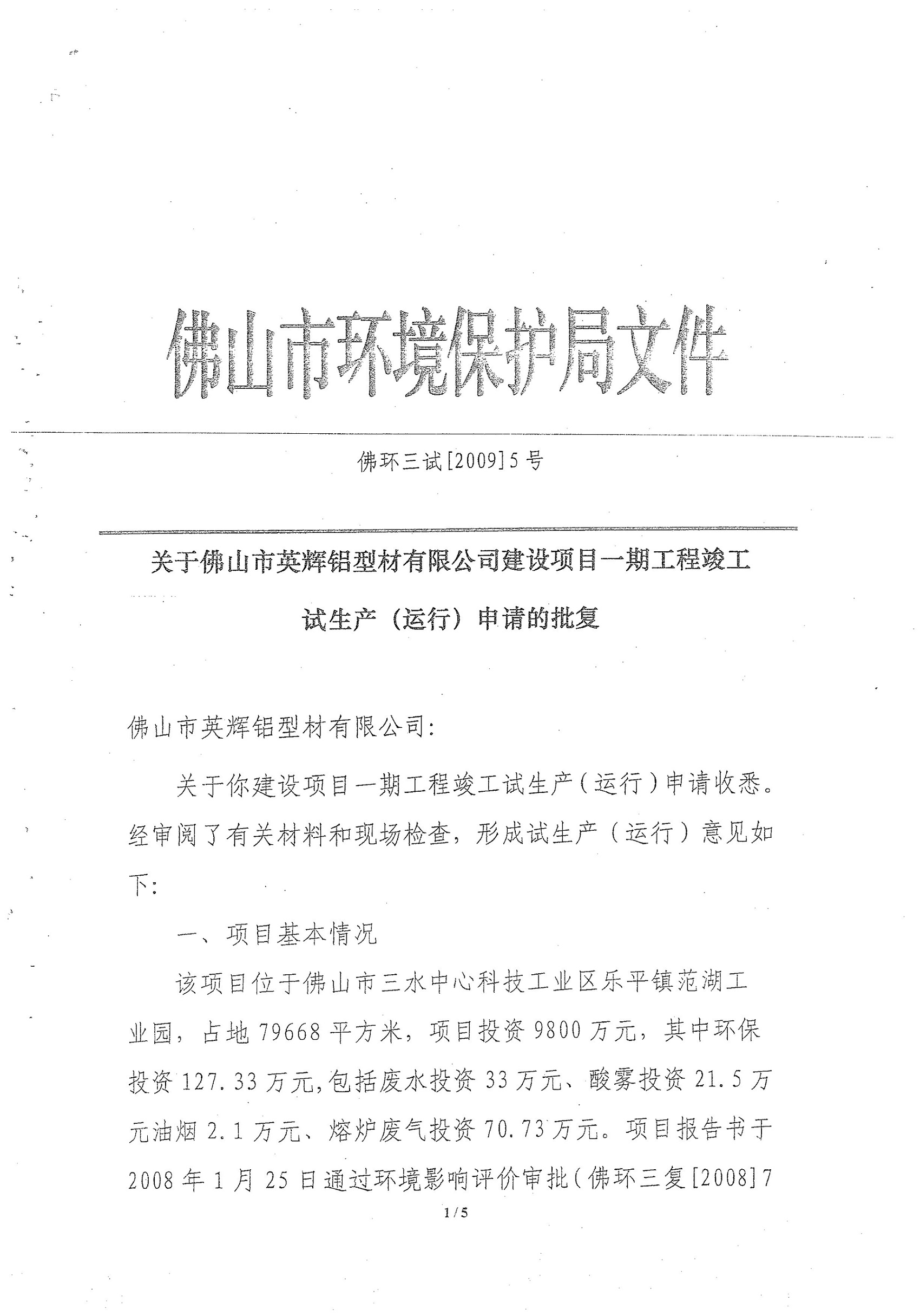 关于佛山市英辉铝型材有限公司建设项目一期工程竣工试生产(运行)申请的批复