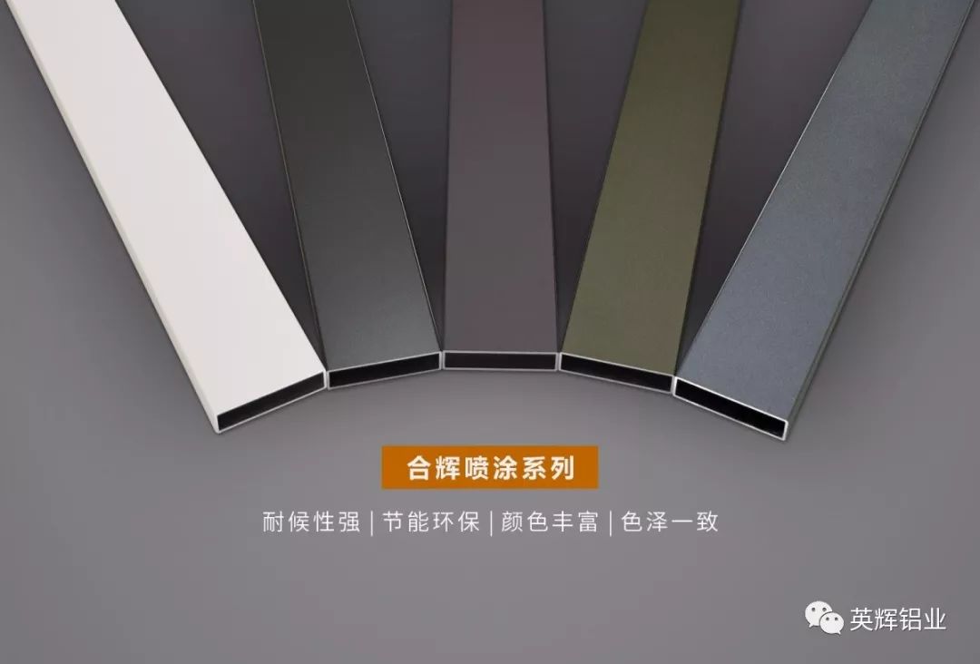 合辉喷涂系列型材采用国外进口喷涂粉末(阿克苏粉、老虎粉),且使用国际先进的喷涂设备(瑞士金马),使喷涂产品具有耐酸雨、耐碱度高、颜色款式丰富、色泽一致及膜厚均匀的特点。